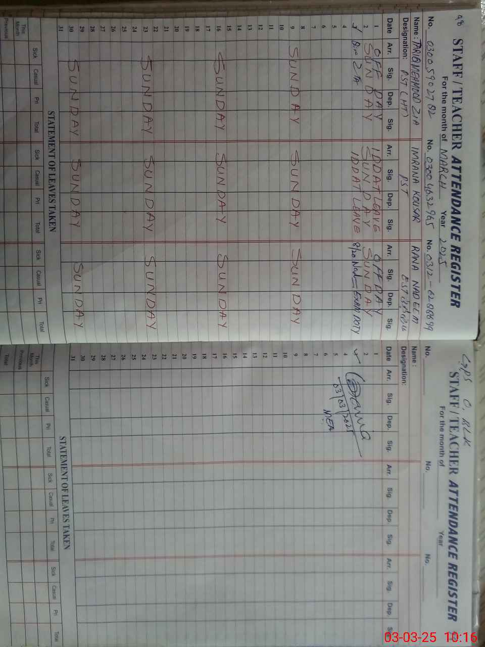 | 38**** | Ha**** Ul**** Kh**** | EST(GENERAL) | Temporary | 0 | 0 | 0 | 0 | 0 | 0 | 0 | 0 | 0 | Exam Duty |