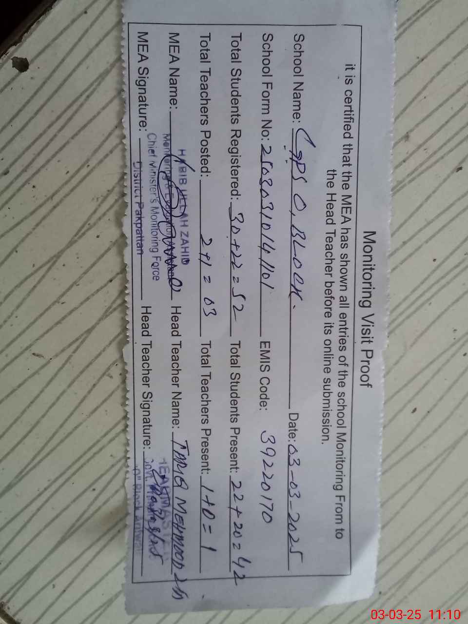 | Attendance Register | Head Teacher | MEA with School | Visit Proof |