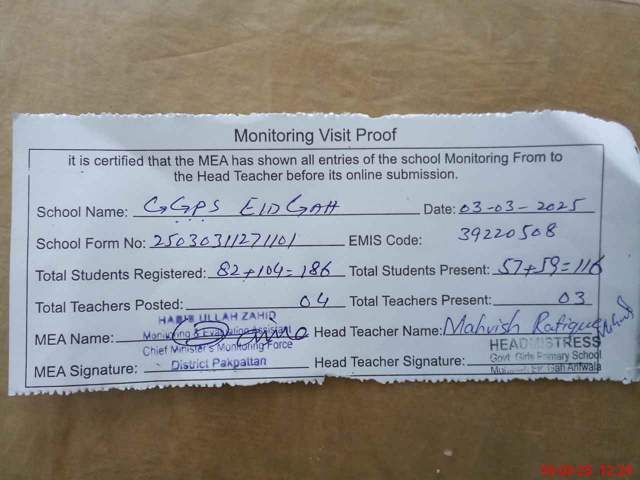 | EMIS Code: 39220508 | Name of School: GGPS EID GAH ARIFWALA | |||