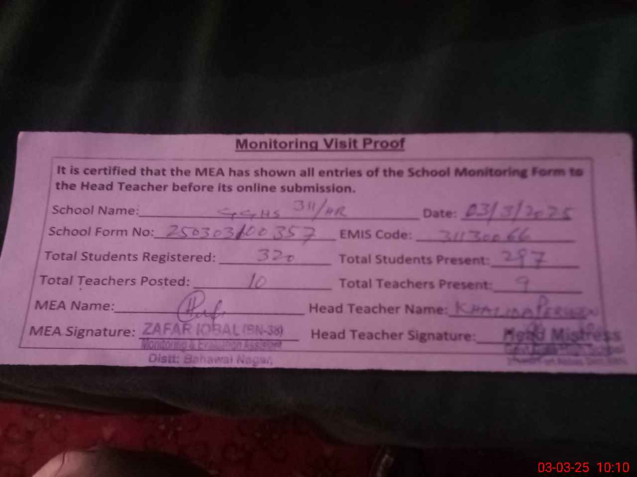 | Monitoring Date: 03-03-2025 | Start Time: 03-03-2025 09:46 AM | End Time: 03-03-2025 10:12 AM | Name of MEA: Za**** Iq**** BN**** | |