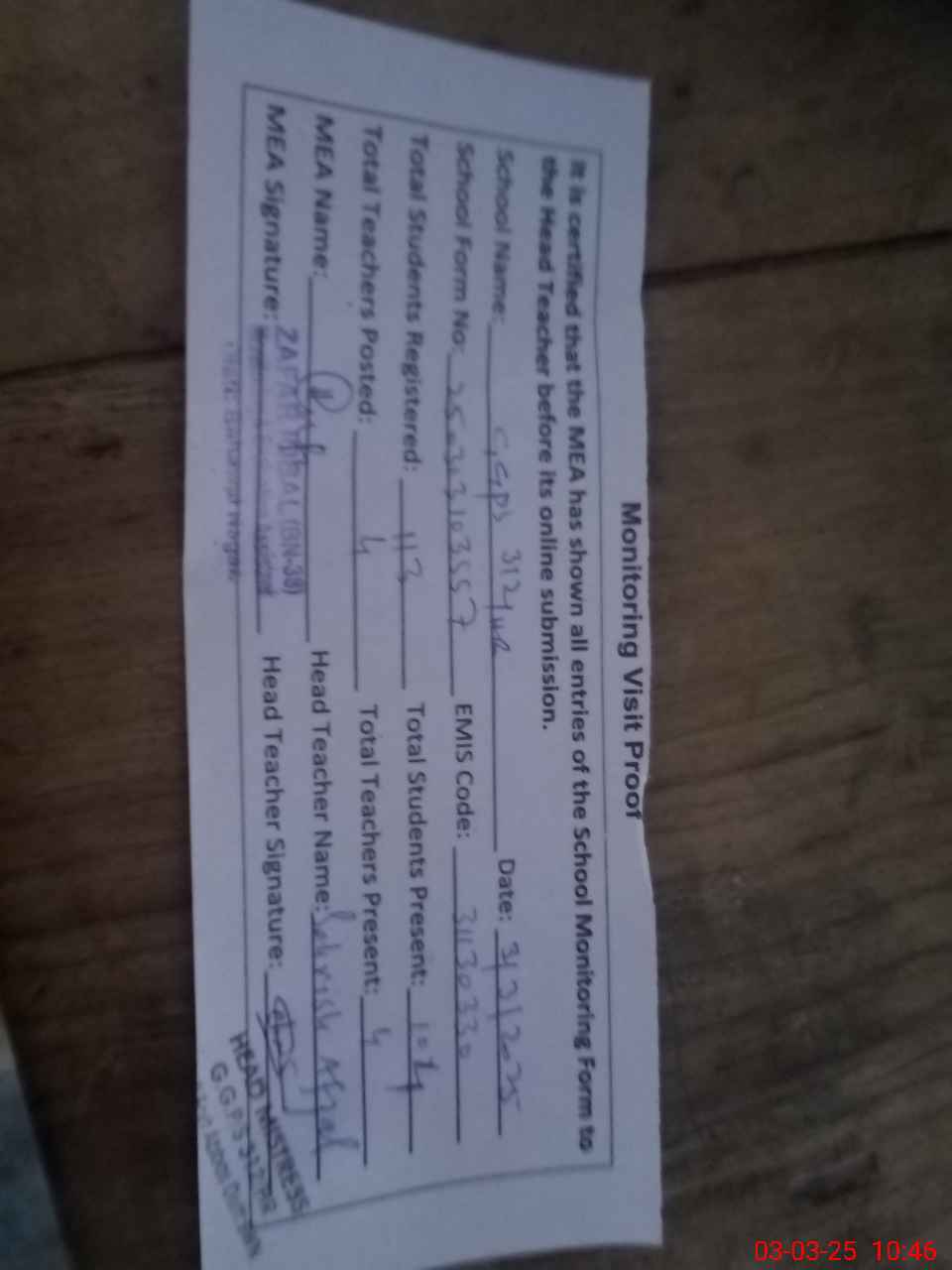 | Attendance Register | Head Teacher | MEA with School | Visit Proof |