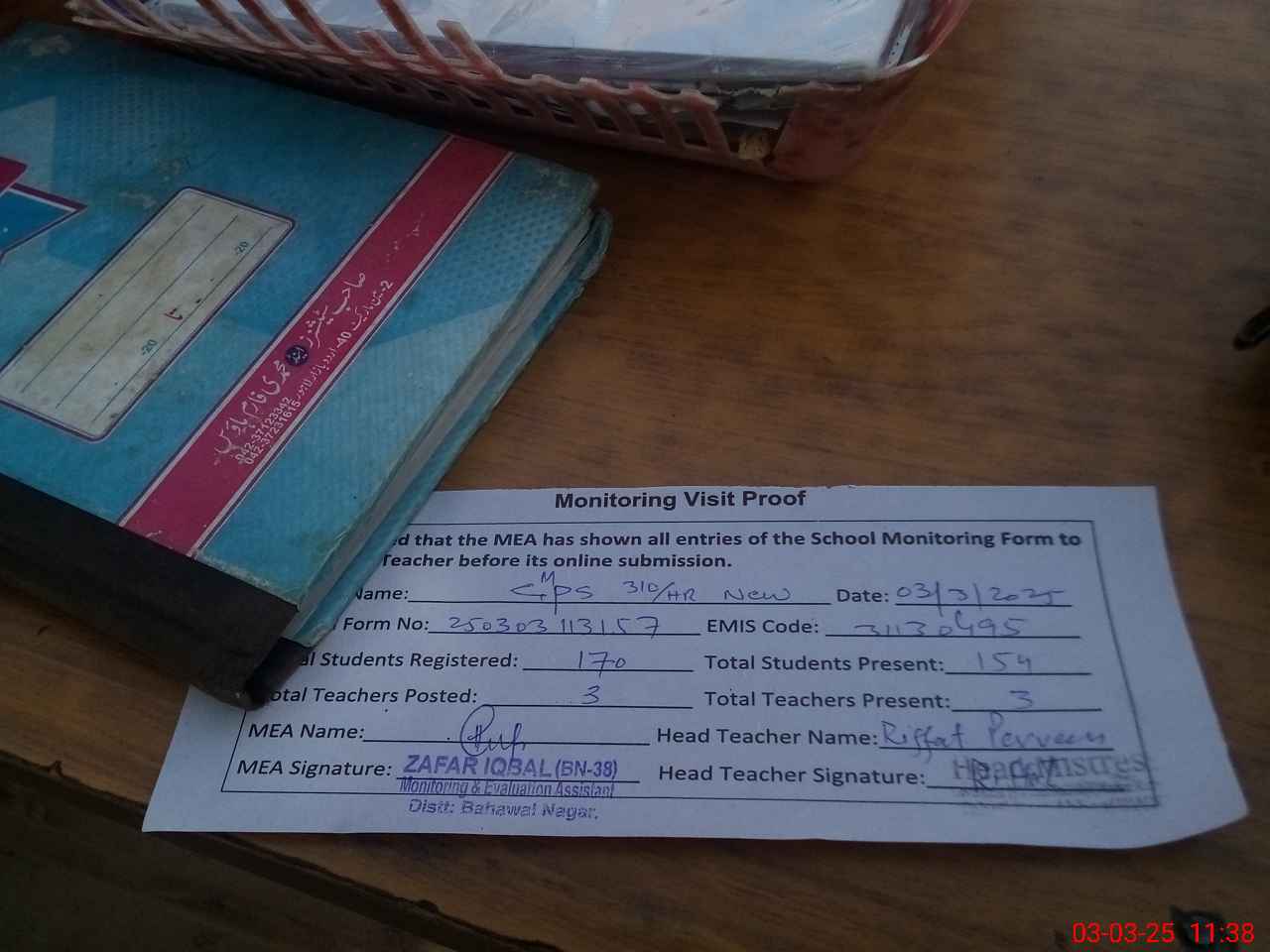 | Attendance Register | Head Teacher | MEA with School | Visit Proof |