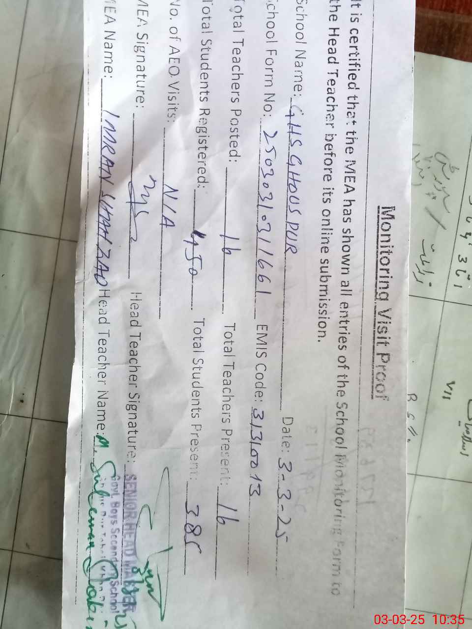 | Attendance Register | Head Teacher | MEA with School | Visit Proof |