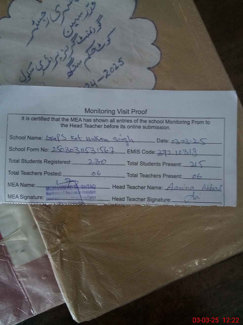 | EMIS Code: 39210318 | Name of School: GGPS KOT HUKAM SINGH | |||