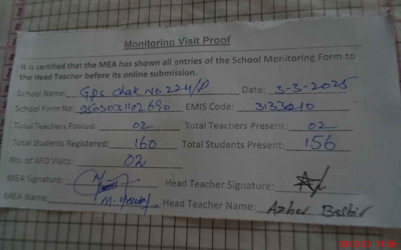 | EMIS Code: 31330210 | Name of School: GPS CHAK NO. 224/P | |||