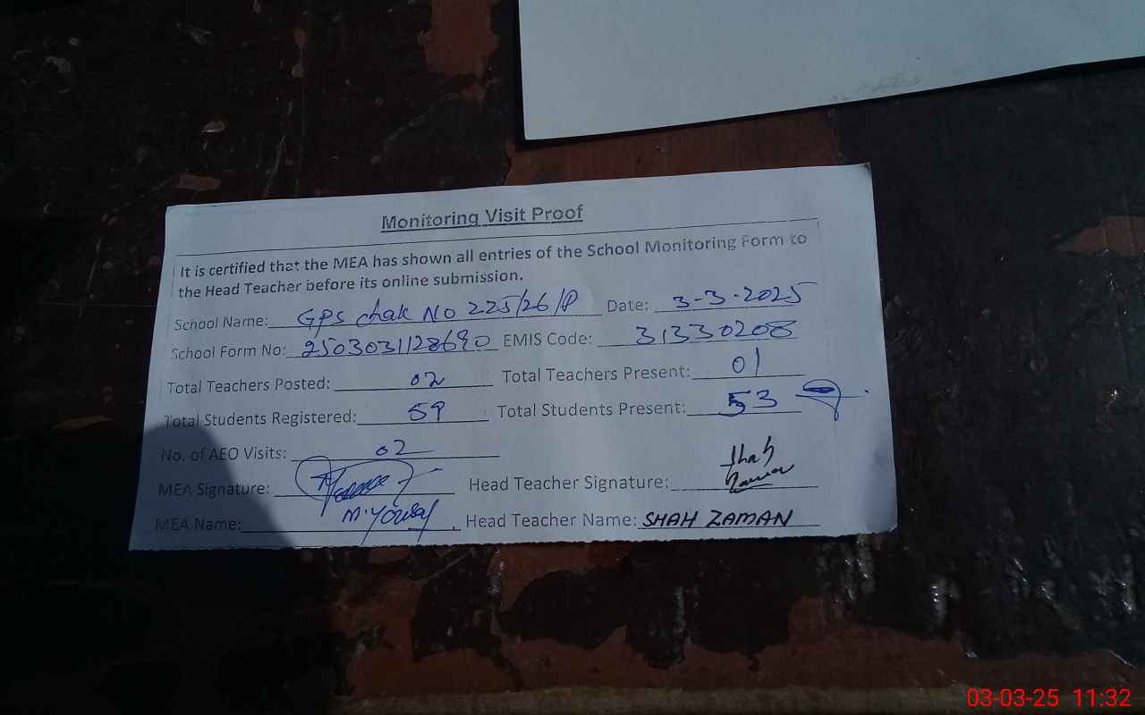 | EMIS Code: 31330208 | Name of School: GPS CHAK NO. 225-26/P | |||