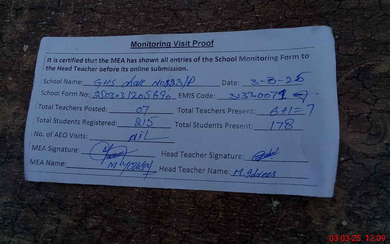 | EMIS Code: 31330071 | Name of School: GHS CHAK NO. 223/P | |||