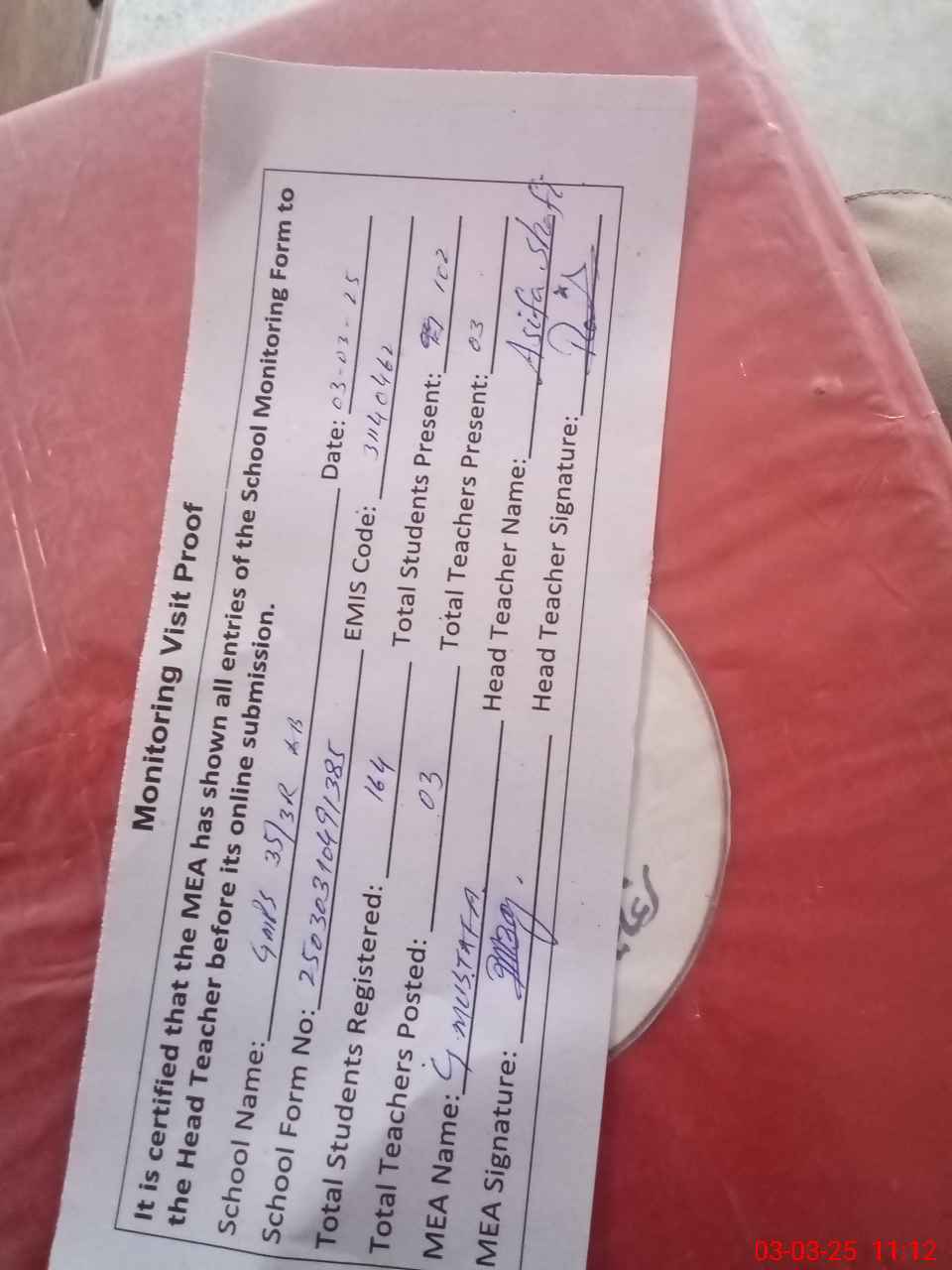 | Attendance Register | Head Teacher | MEA with School | Visit Proof |