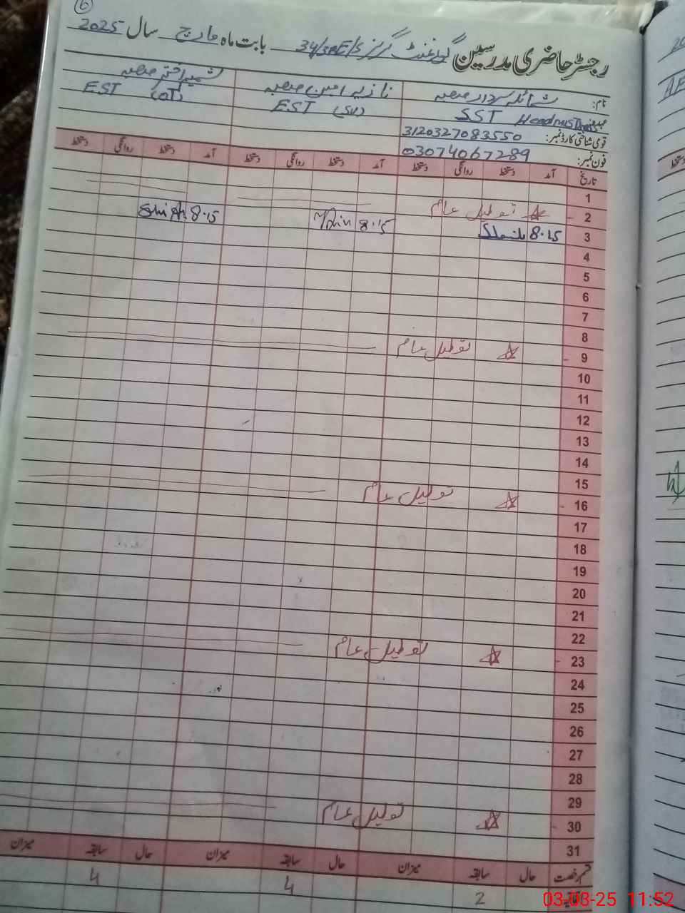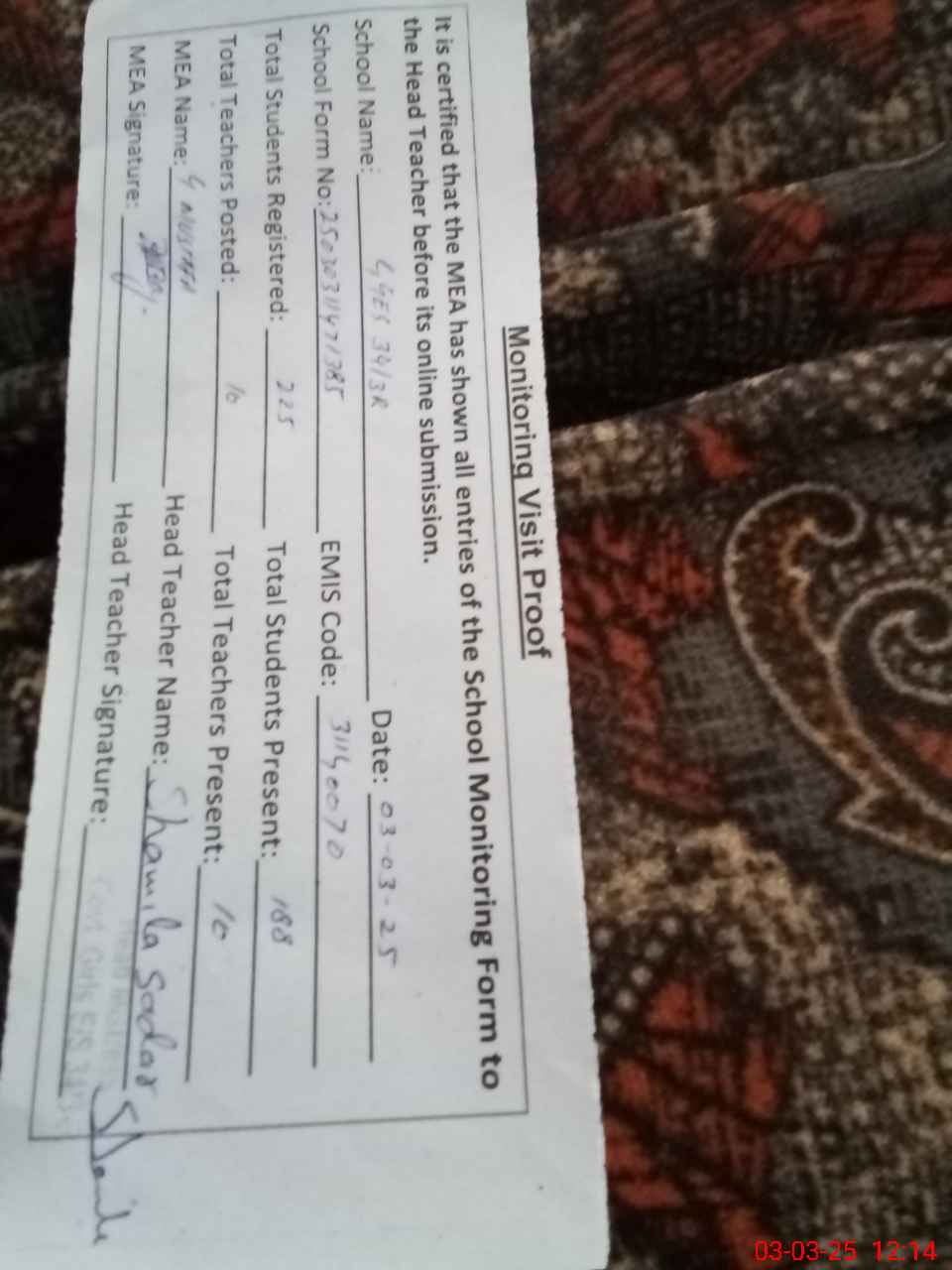 | Name: SH**** SA**** Designation: (School Headmaster's/Headmistress's) S.S.T.(Arts) Phone/Cell Number: 03**** |