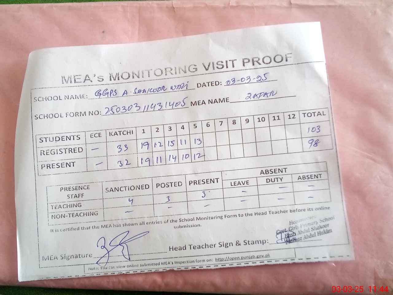 | Attendance Register | Head Teacher | MEA with School | Visit Proof |