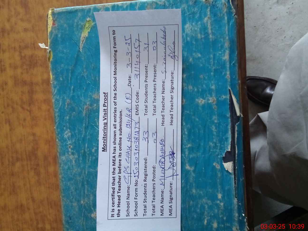| Attendance Register | Head Teacher | MEA with School | Visit Proof |