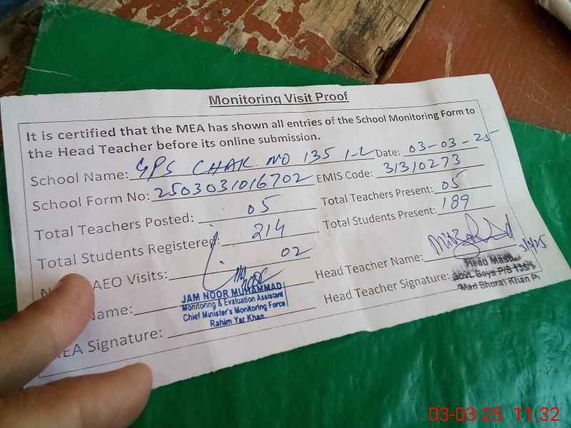 | EMIS Code: 31310273 | Name of School: GPS CHAK NO. 135/1-L (After Noon) | |||