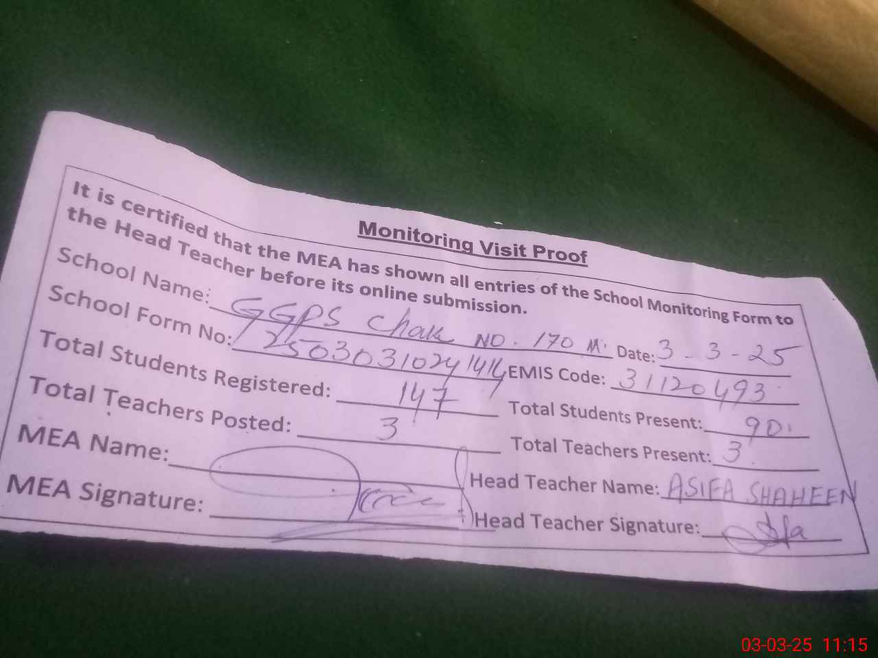 | Attendance Register | Head Teacher | MEA with School | Visit Proof |