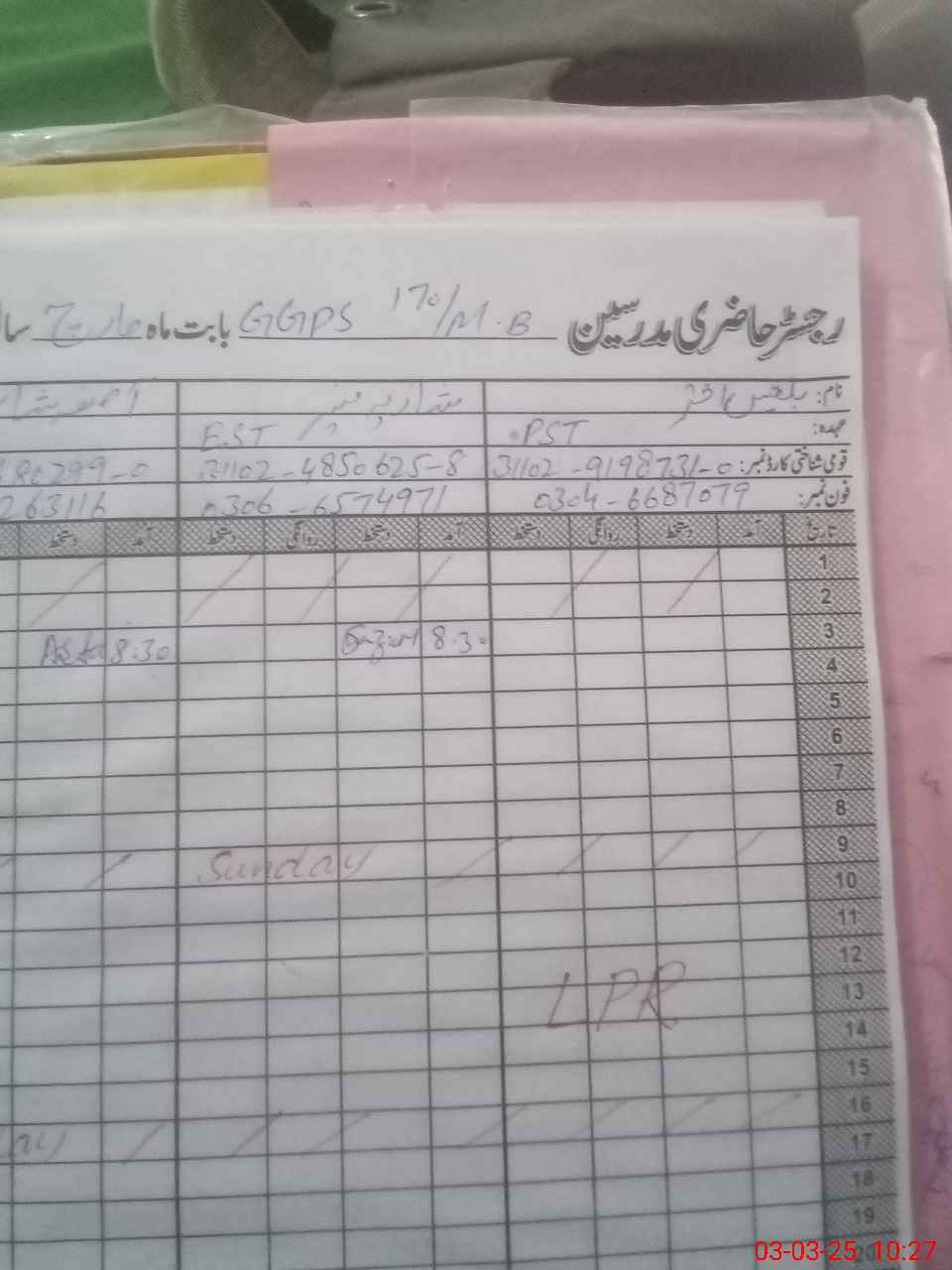 | Name: As**** Sh**** Designation: (School Headmaster's/Headmistress's) PST Phone/Cell Number: 03**** |