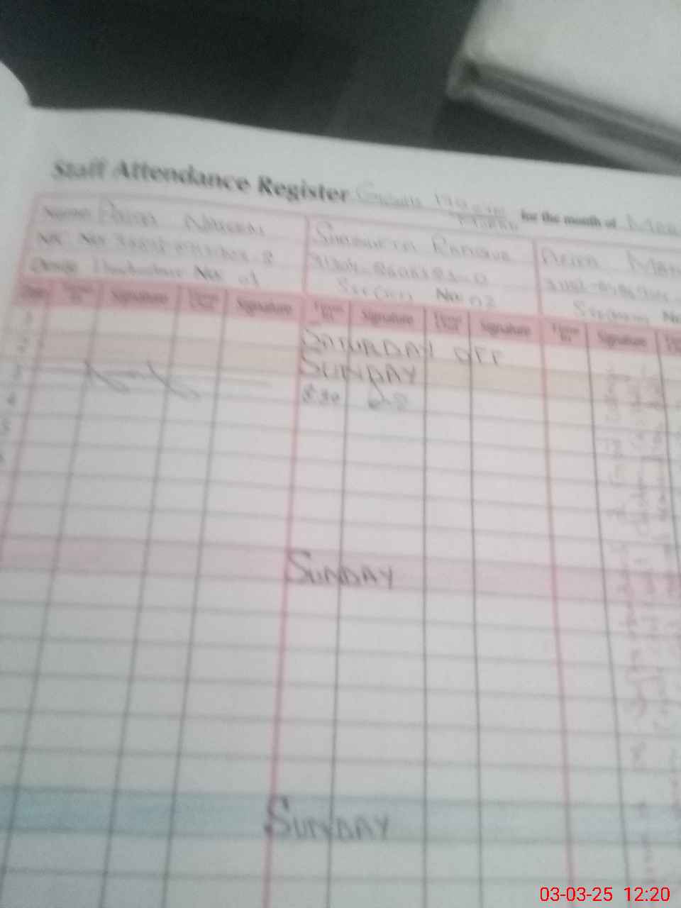 | CNIC | Full Name | Designation | R/C | Absence During Last Calender Month |