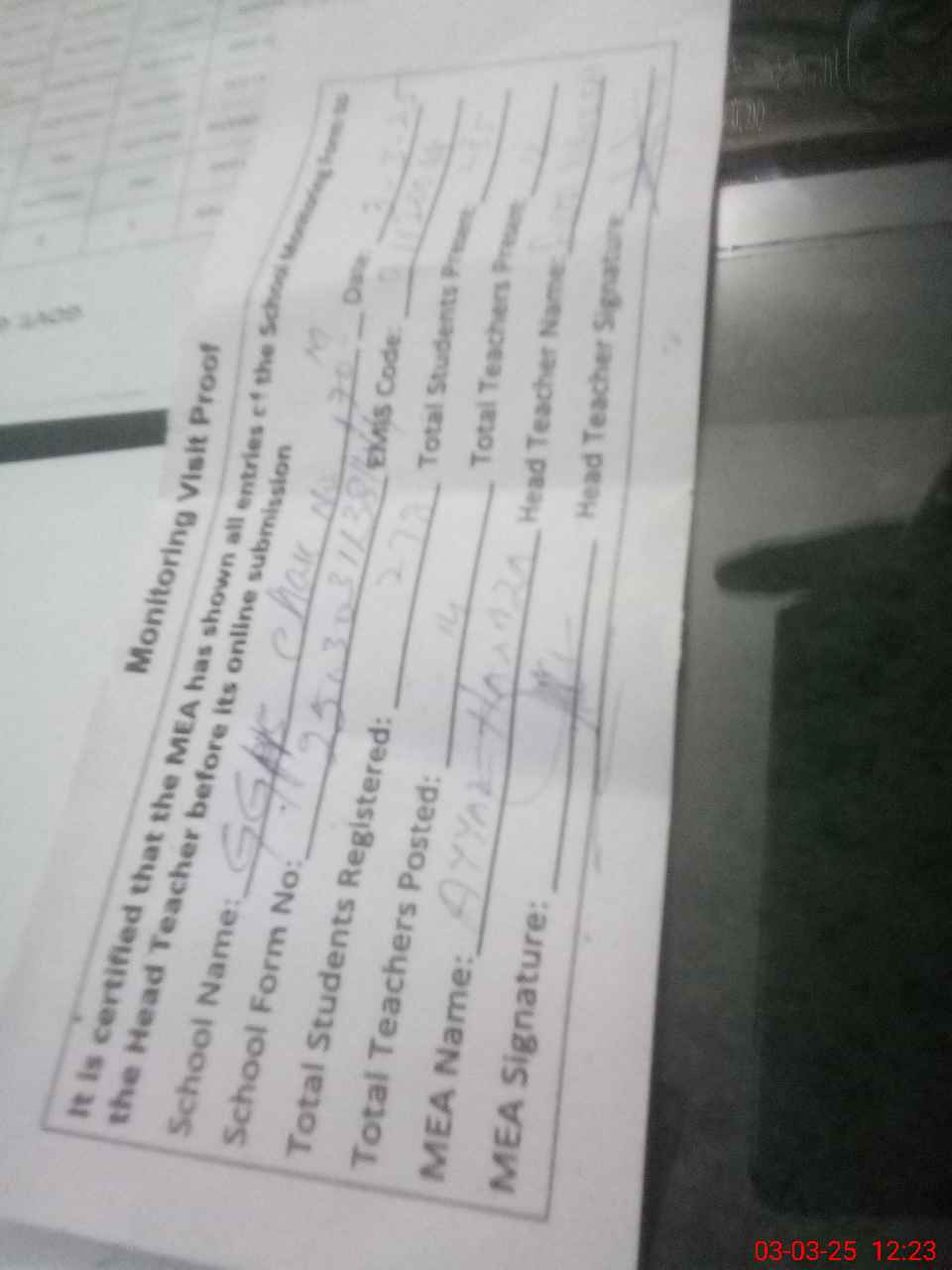 | Attendance Register | Head Teacher | MEA with School | Visit Proof |