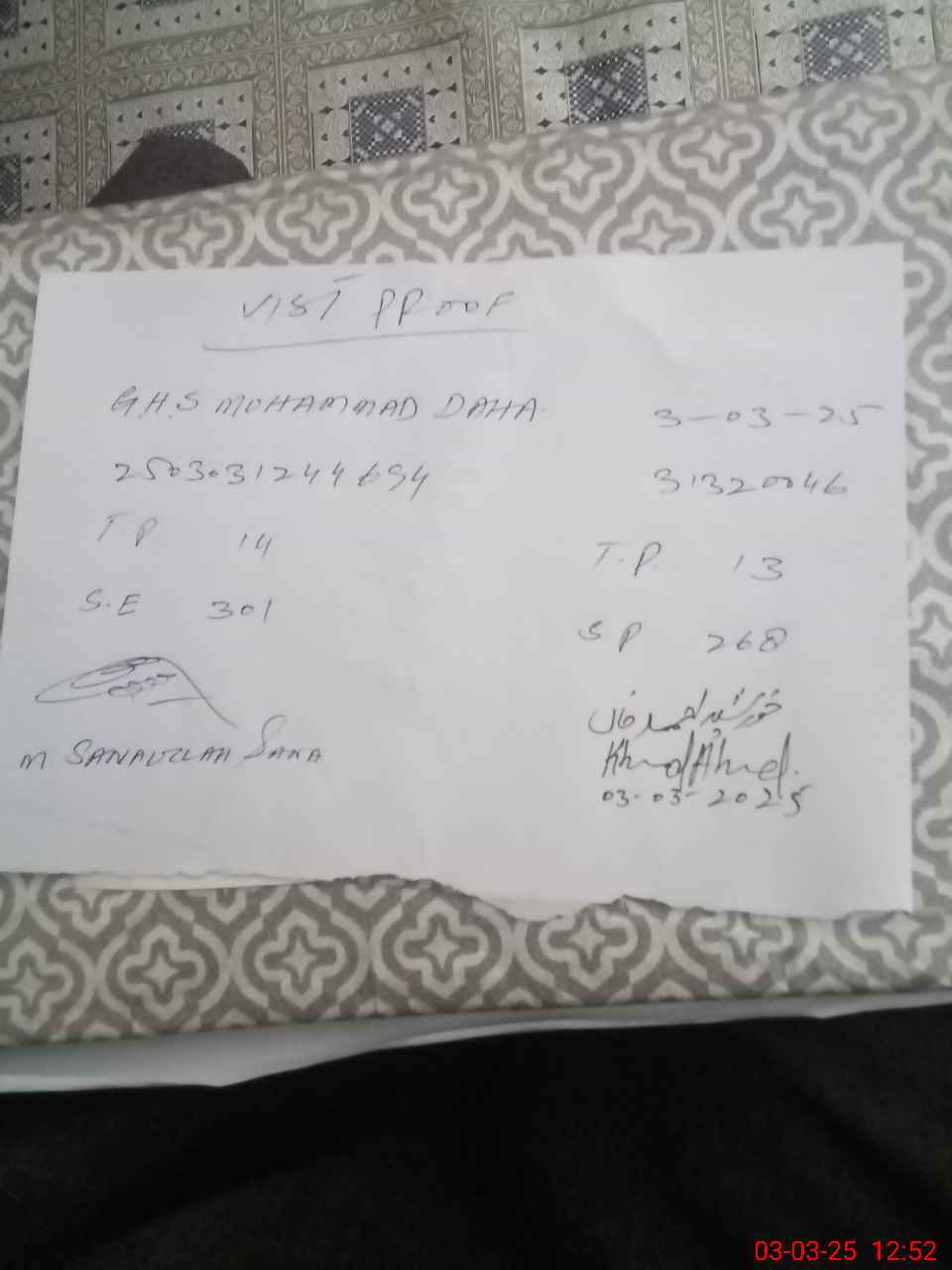 | Name: TA**** HU**** Designation: (School Headmaster's/Headmistress's) S.S.T.(G) Phone/Cell Number: 03**** |
