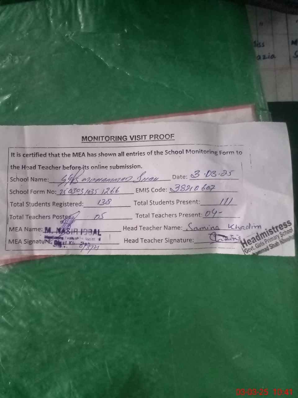 | Attendance Register | Head Teacher | MEA with School | Visit Proof |
