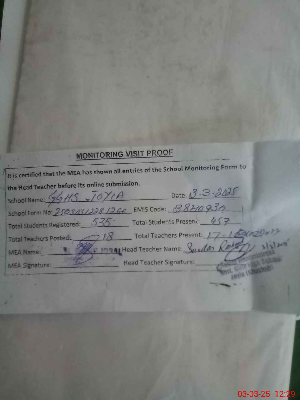 | EMIS Code: 38210930 | Name of School: GGHS JOYIA | |||