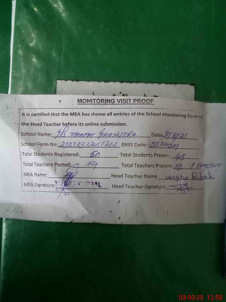 | Attendance Register | Head Teacher | MEA with School | Visit Proof |
