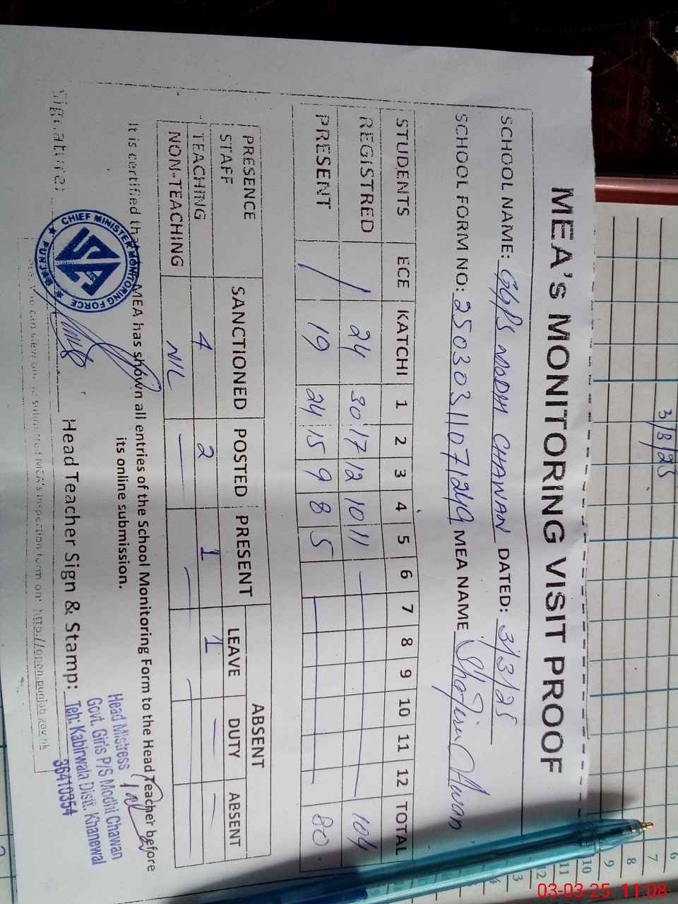 | Attendance Register | Head Teacher | MEA with School | Visit Proof |
