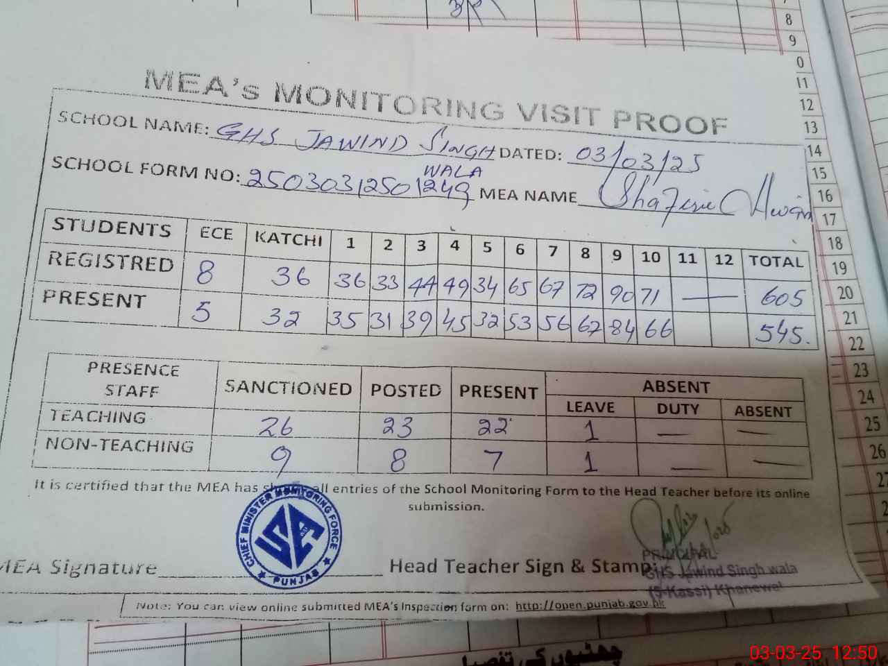 | Attendance Register | Head Teacher | MEA with School | Visit Proof |