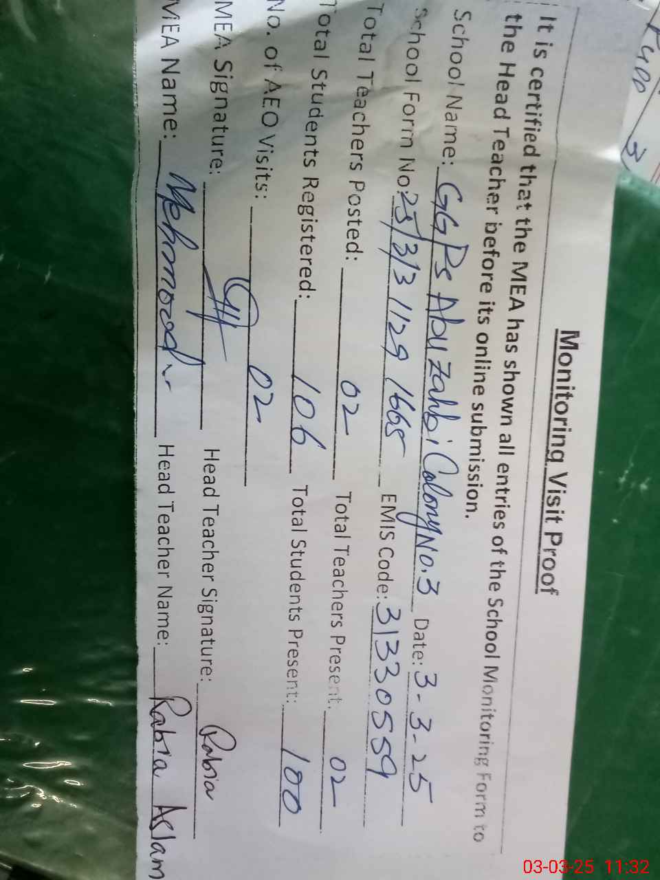 | EMIS Code: 31330559 | Name of School: GGPS NO.3 ABU ZAHBI COLONY NO 3 | |||