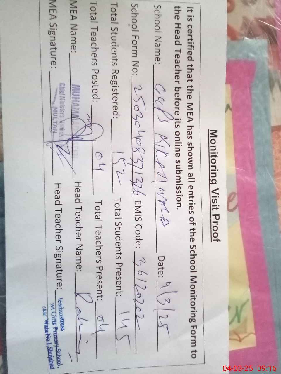 | Attendance Register | Head Teacher | MEA with School | Visit Proof |