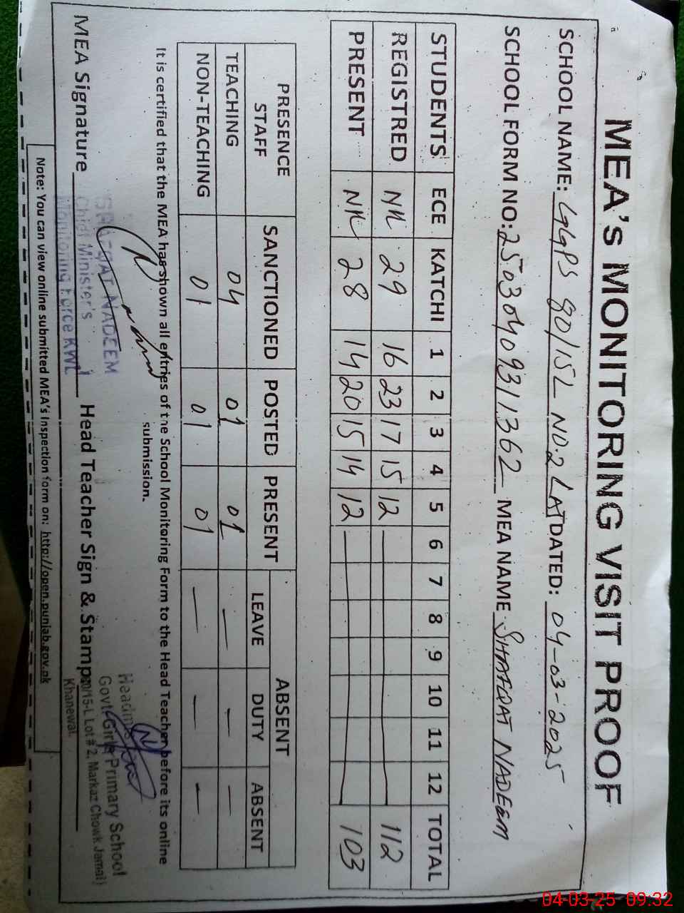 | Attendance Register | Head Teacher | MEA with School | Visit Proof |