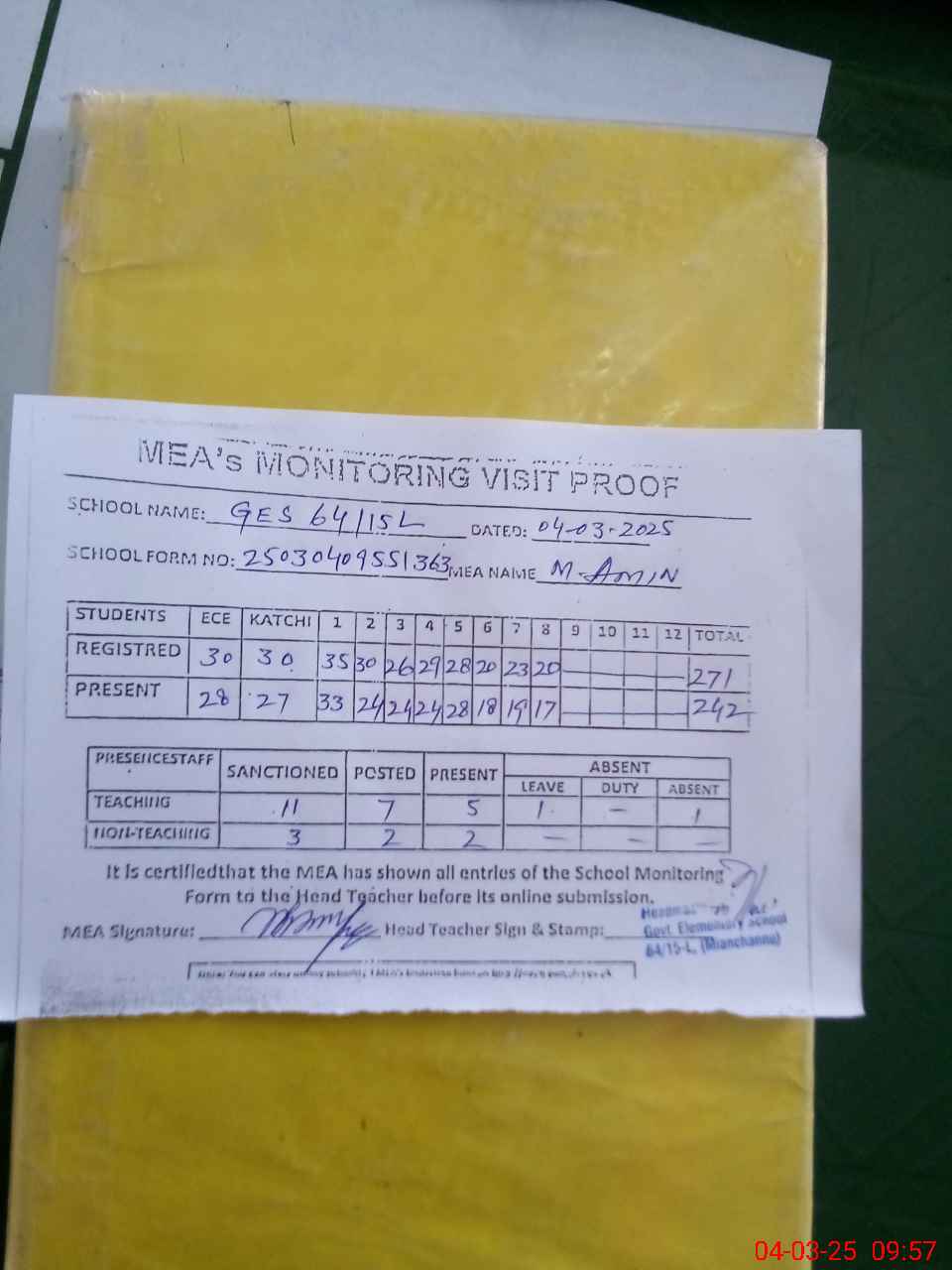 | Attendance Register | Head Teacher | MEA with School | Visit Proof |