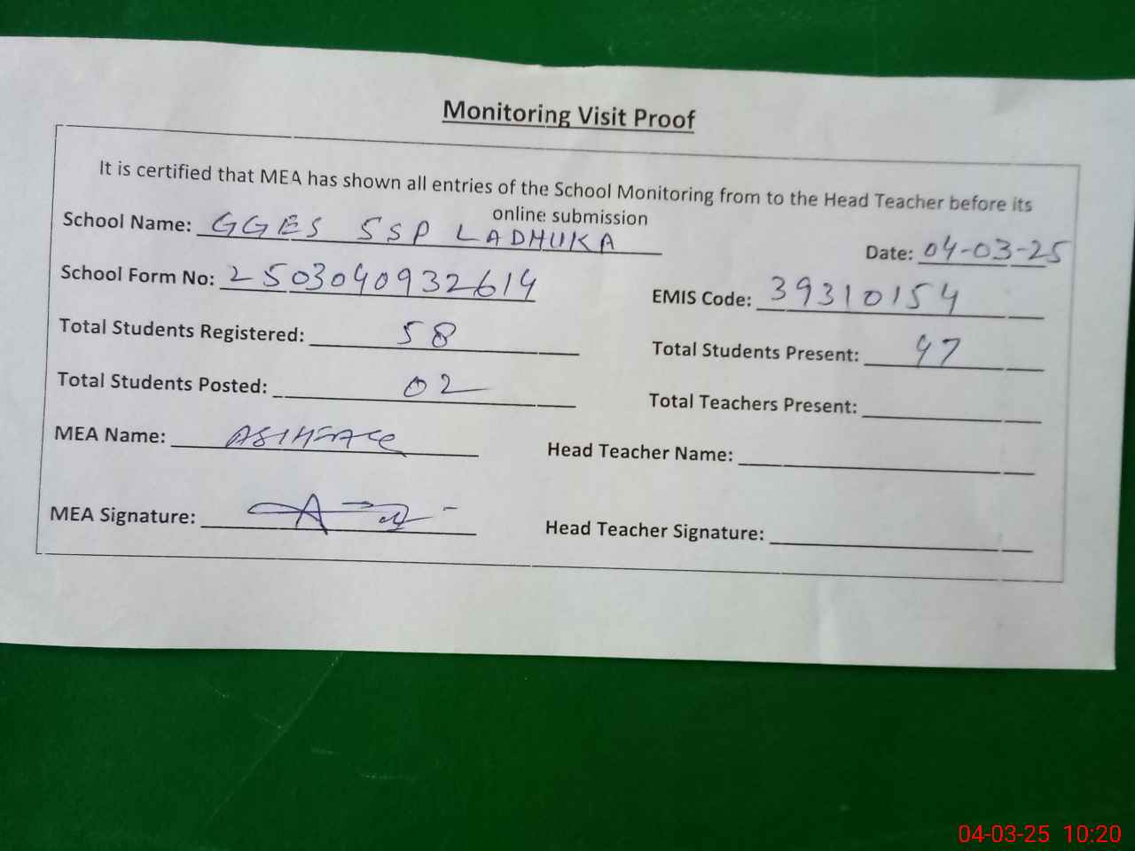 | Attendance Register | Head Teacher | MEA with School | Visit Proof |