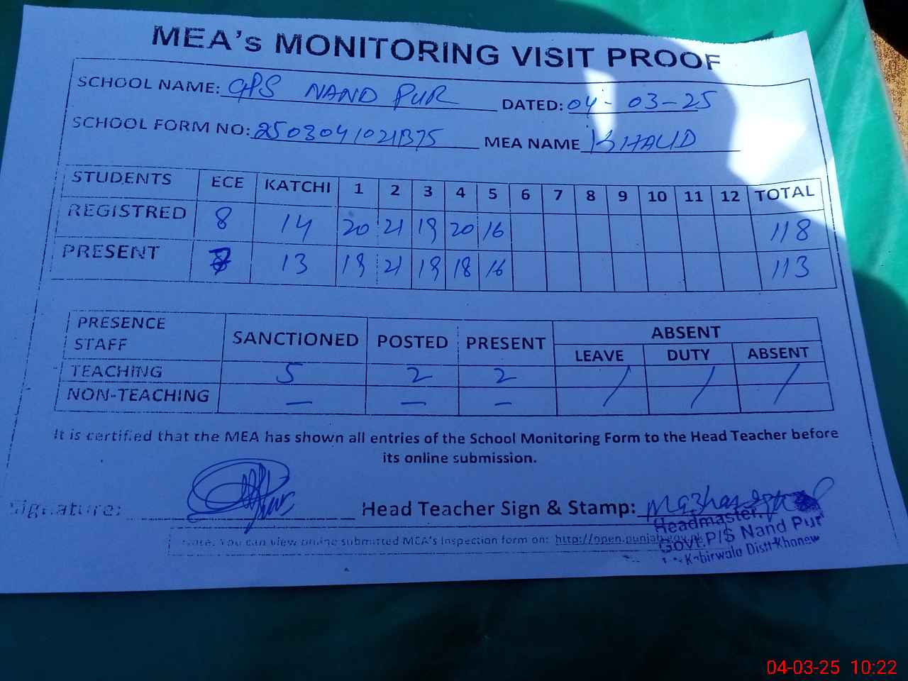| EMIS Code: 36410245 | Name of School: GPS NAND PUR, SARAI SIDHU | |||
