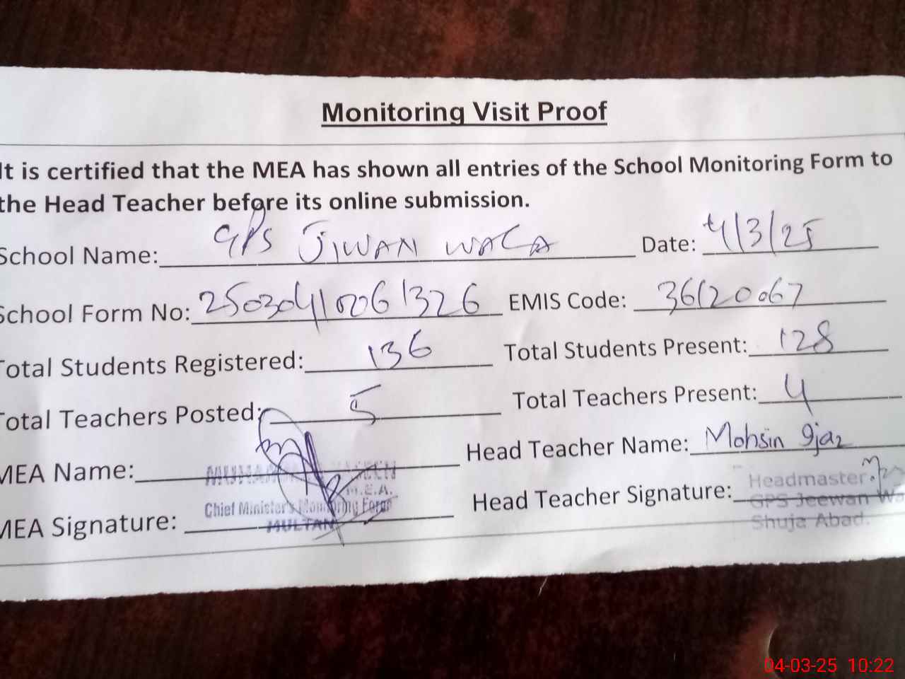 | Attendance Register | Head Teacher | MEA with School | Visit Proof |