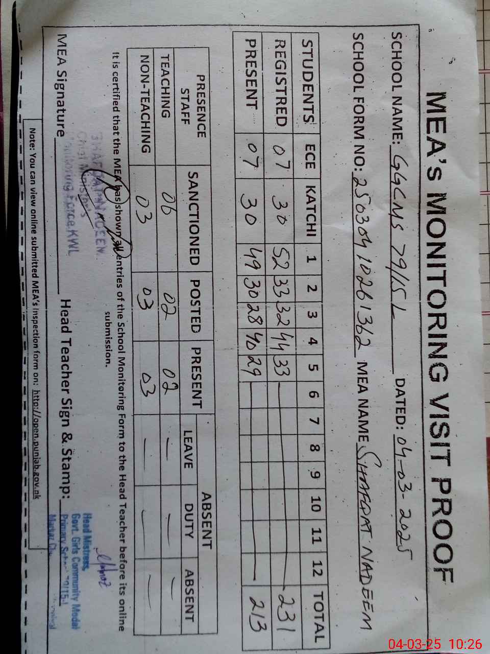 | Attendance Register | Head Teacher | MEA with School | Visit Proof |