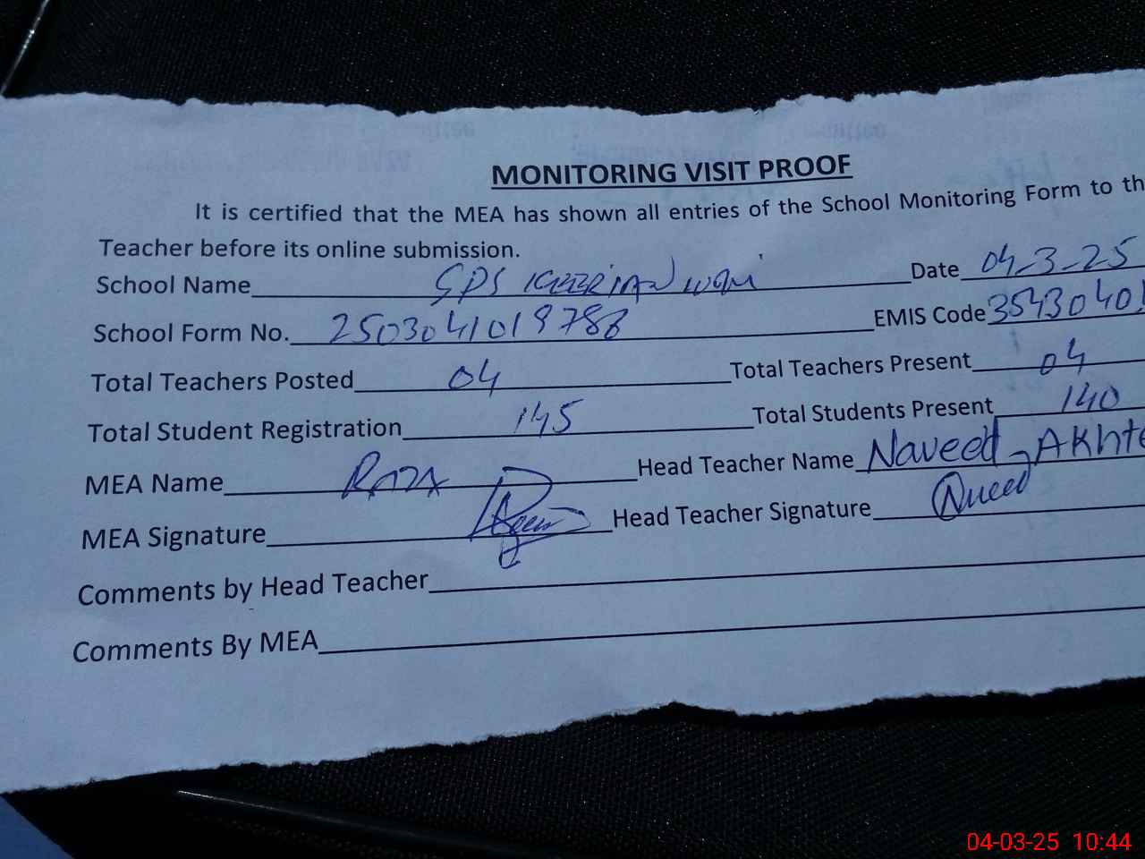 | Attendance Register | Head Teacher | MEA with School | Visit Proof |