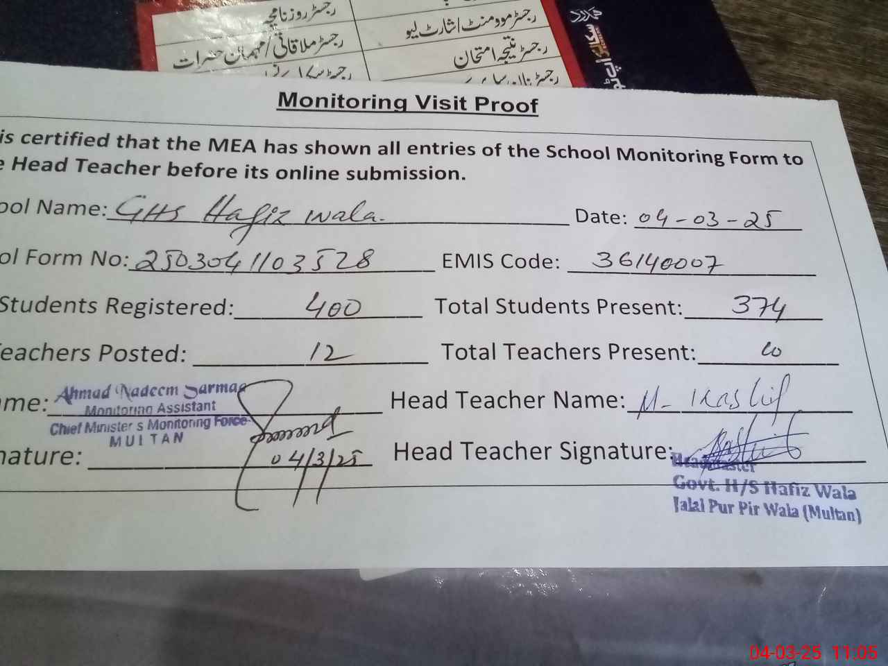 | Attendance Register | Head Teacher | MEA with School | Visit Proof |