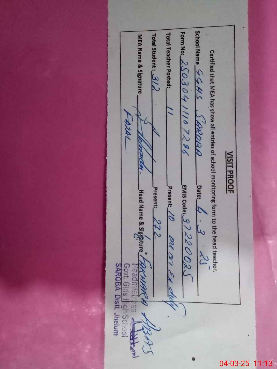 | Attendance Register | Head Teacher | MEA with School | Visit Proof |