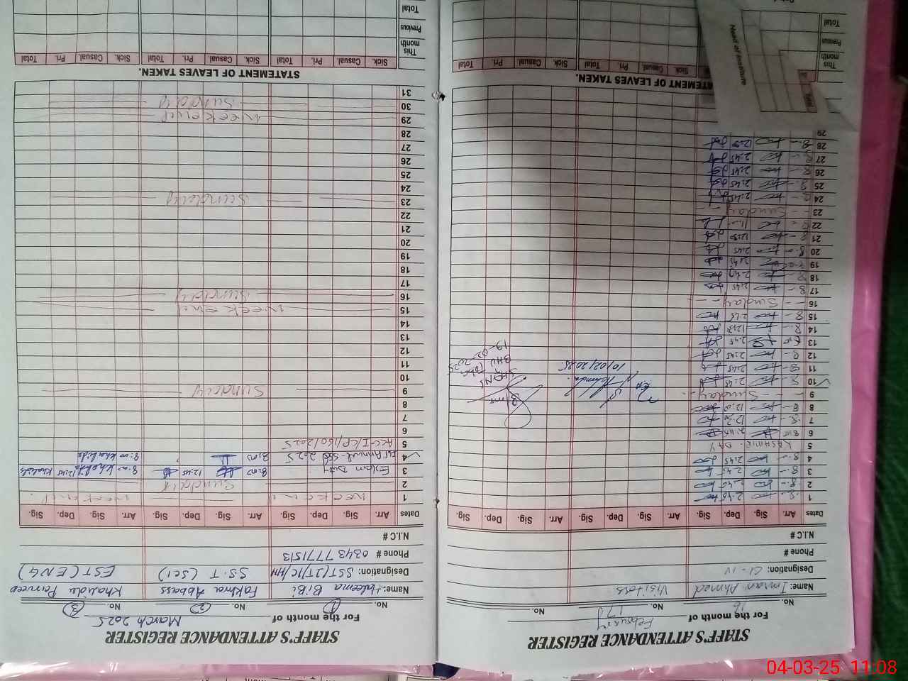 | CNIC | Full Name | Designation | R/C | Absence During Last Calender Month |