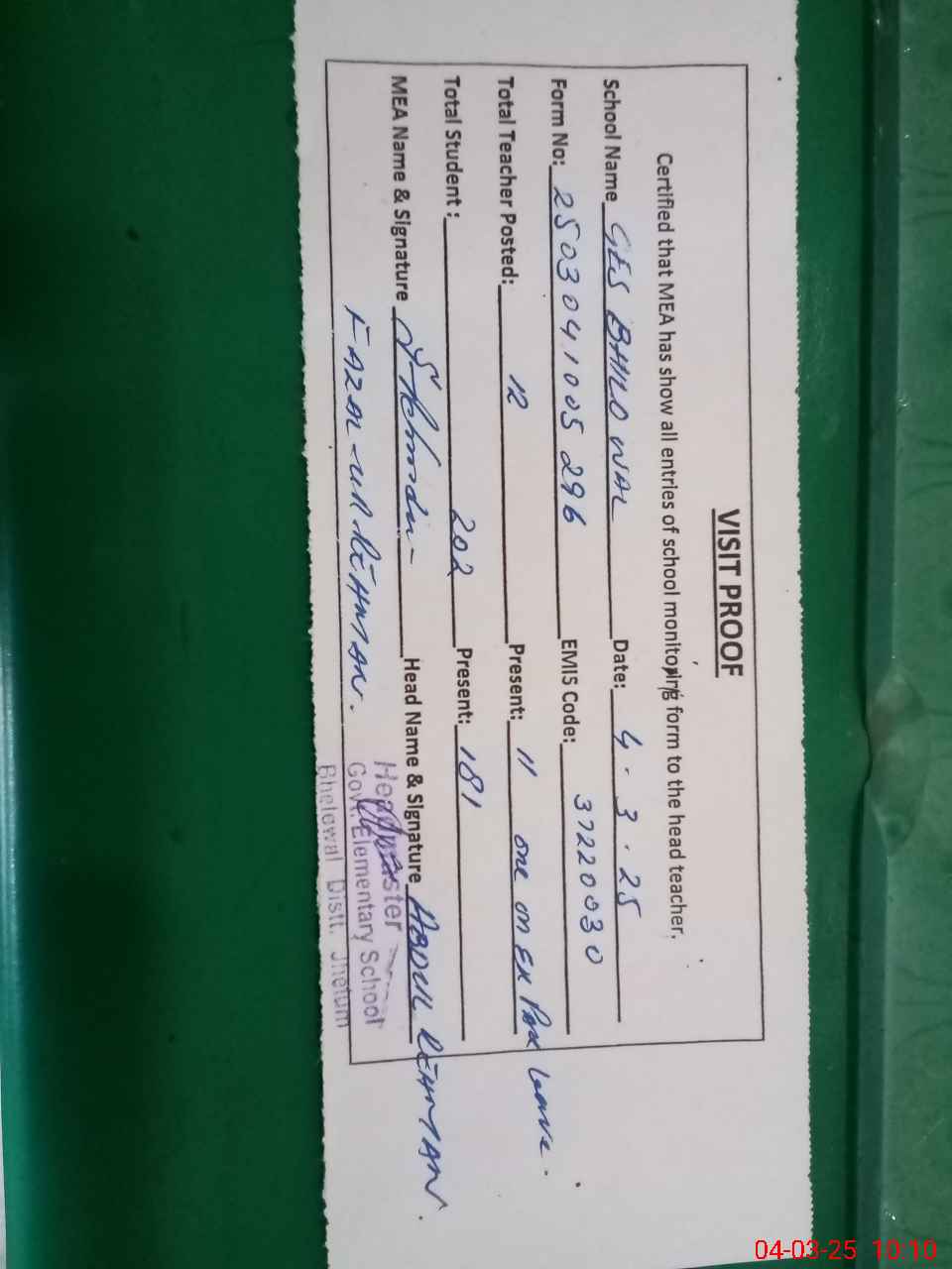 | Attendance Register | Head Teacher | MEA with School | Visit Proof |