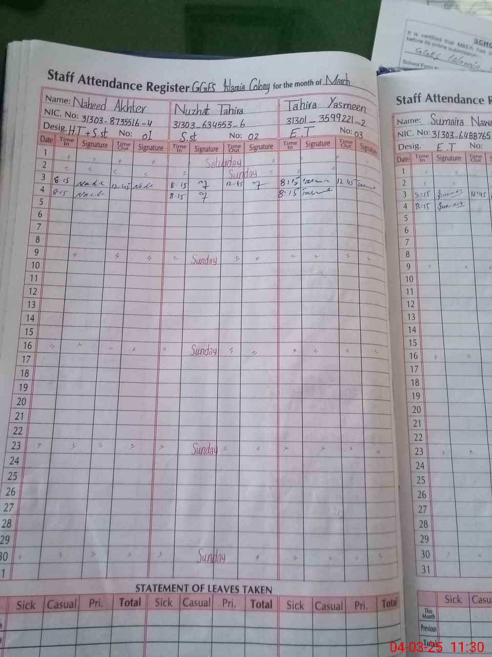 | CNIC | Full Name | Designation | R/C | Absence During Last Calender Month |