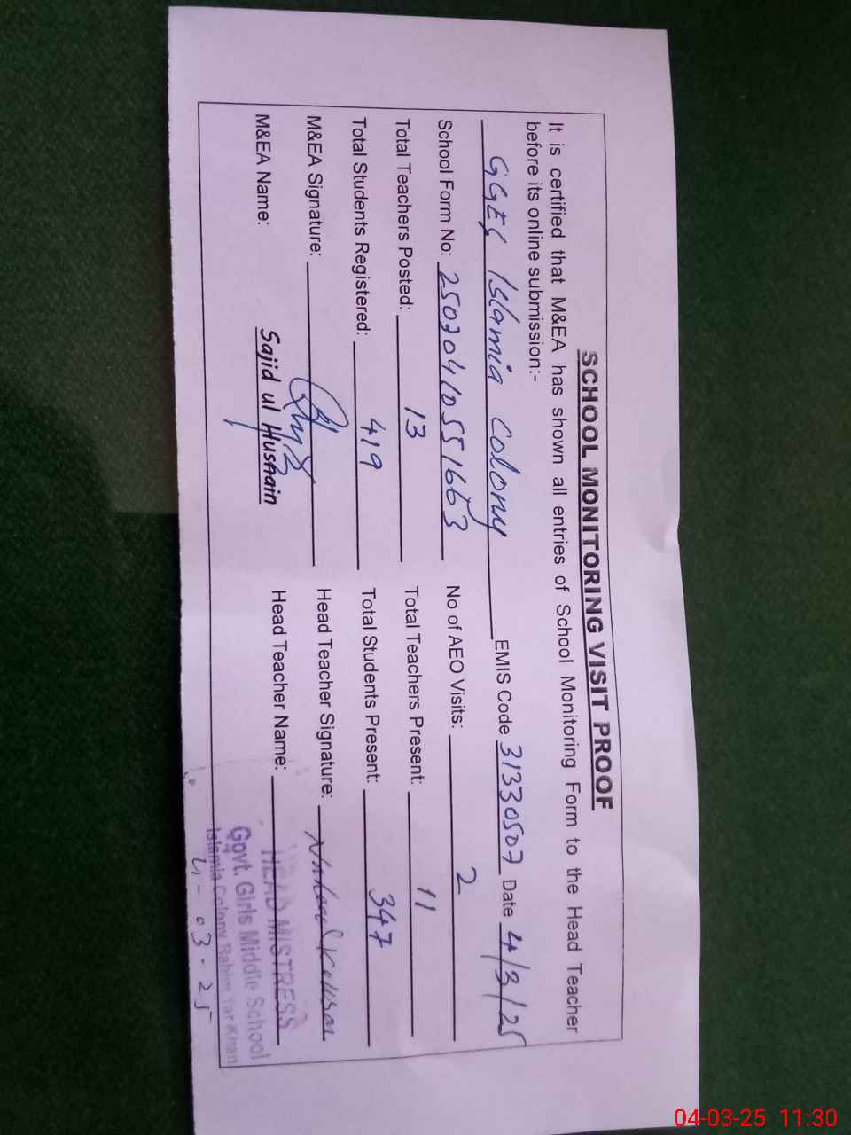 | Attendance Register | Head Teacher | MEA with School | Visit Proof |