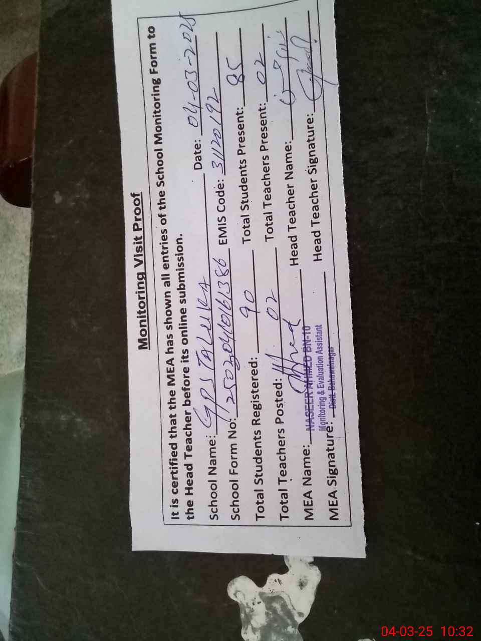 | Attendance Register | Head Teacher | MEA with School | Visit Proof |