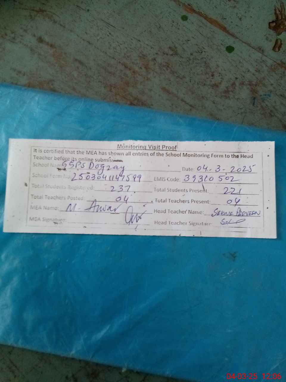 | Attendance Register | Head Teacher | MEA with School | Visit Proof |