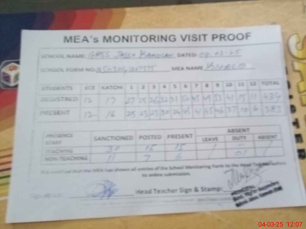 | Attendance Register | Head Teacher | MEA with School | Visit Proof |