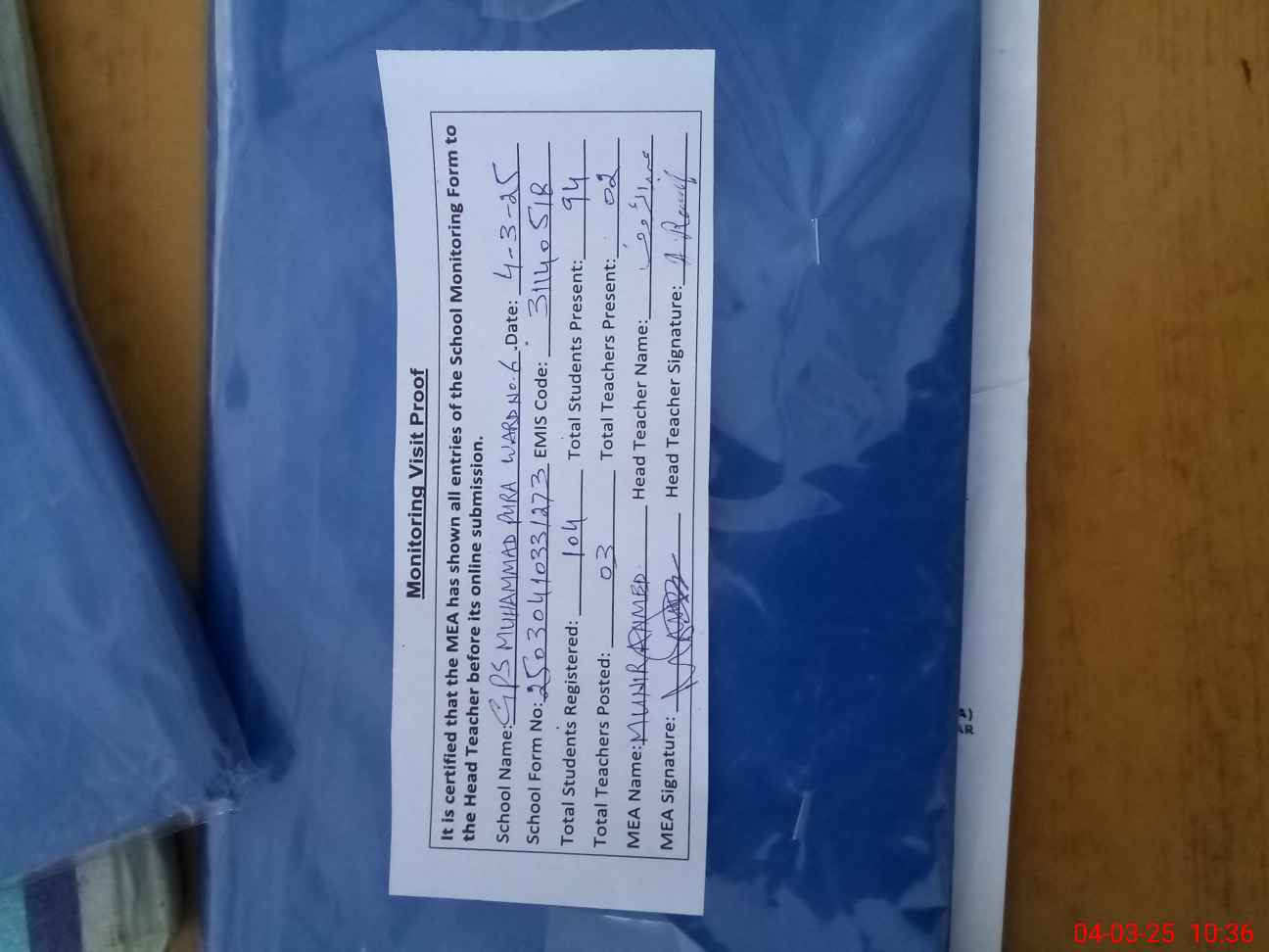 | Attendance Register | Head Teacher | MEA with School | Visit Proof |