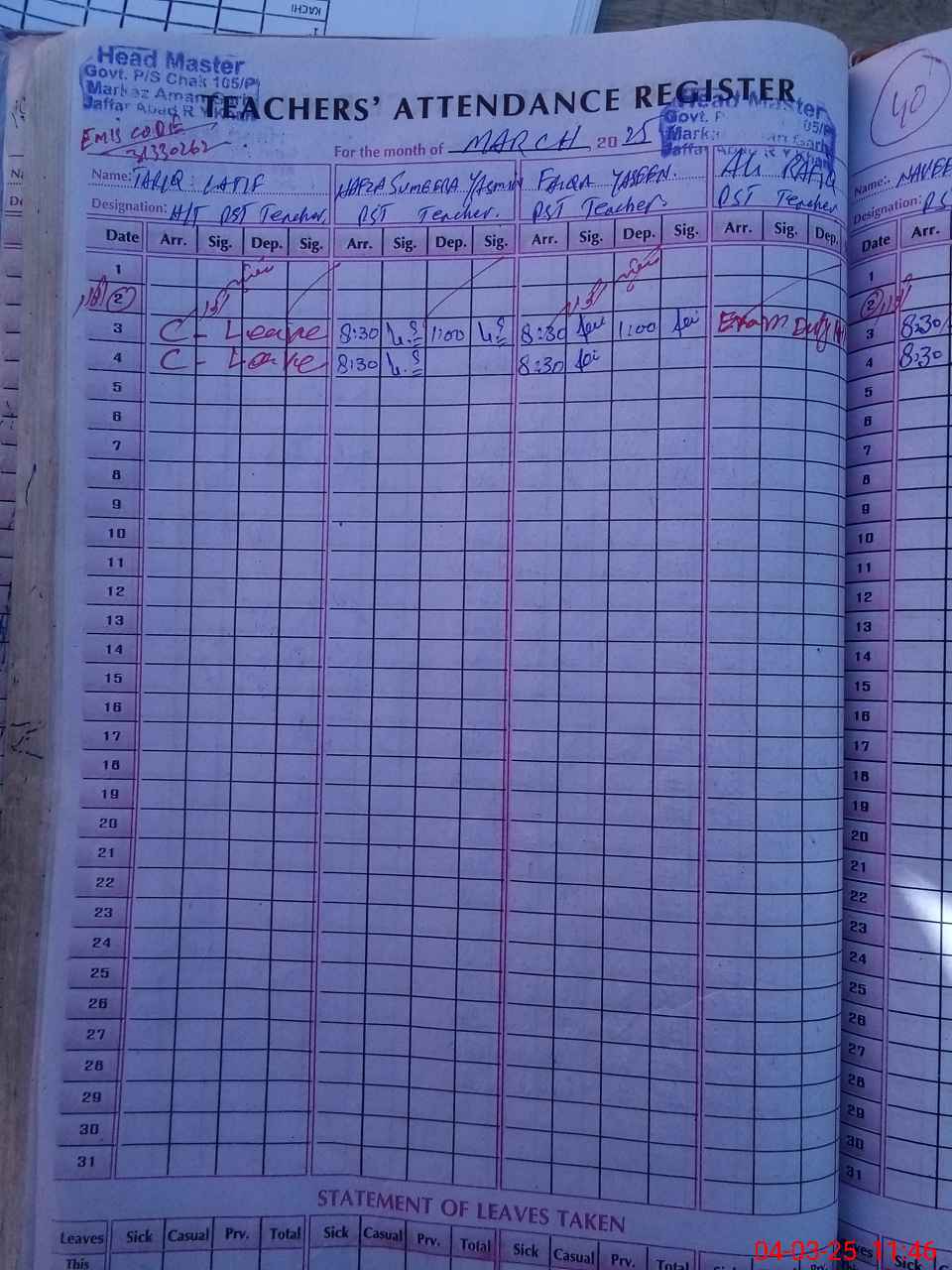 | 31**** | Al**** Ra**** | PST | Regular | 0 | 0 | 0 | 0 | 0 | 0 | 0 | 0 | 0 | Exam Duty |