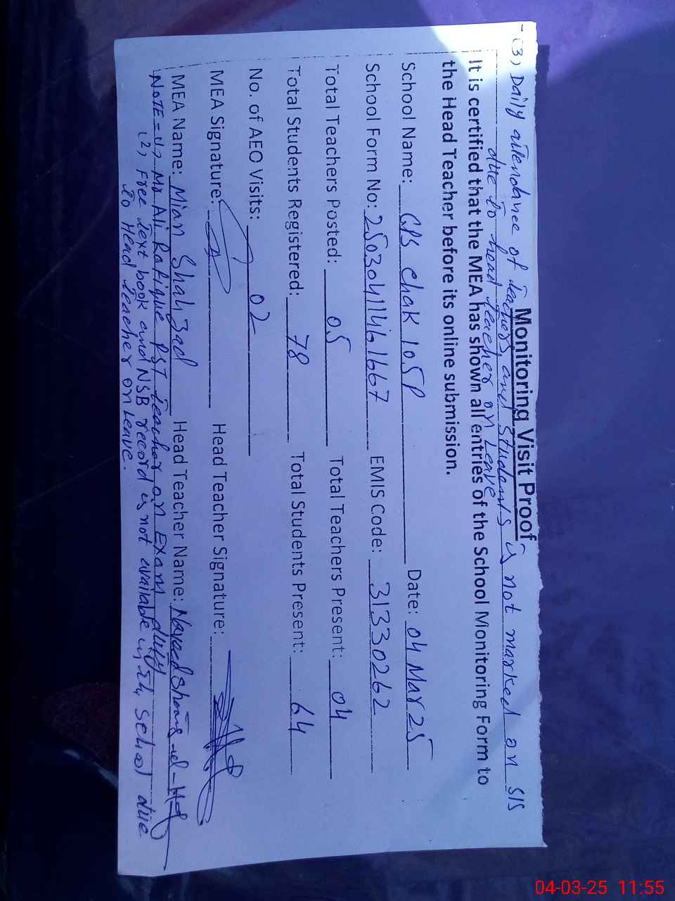 | EMIS Code: 31330262 | Name of School: GPS CHAK 105/P | |||