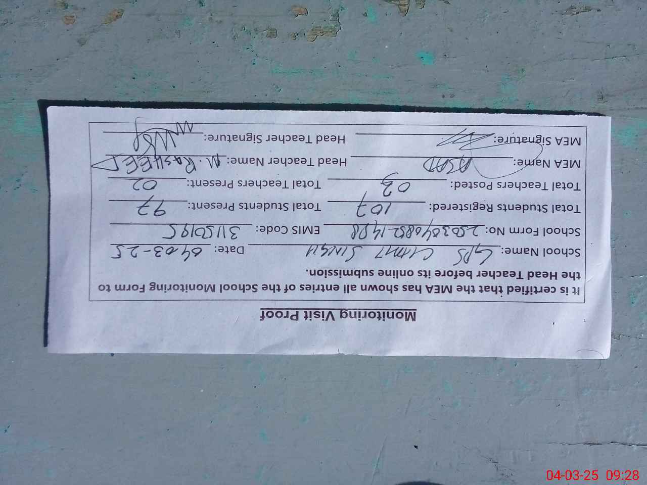 | Attendance Register | Head Teacher | MEA with School | Visit Proof |