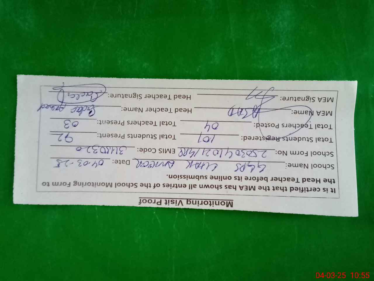 | Attendance Register | Head Teacher | MEA with School | Visit Proof |