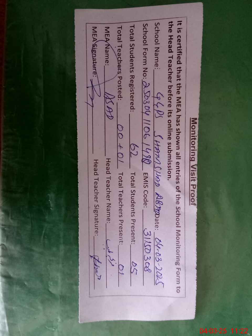 | Attendance Register | Head Teacher | MEA with School | Visit Proof |